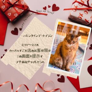 Blog ブログ Home ブログ バレンタインデートプラン 2/11~2/14まで 2022.02.10 バレンタインデートプラン 2/11~2/14まで 2/11~2/14まで期間限定 カップルでご来店のお客様、受け付けにてこの画面を提示でプチ猫おやつプレゼント 一覧に戻る